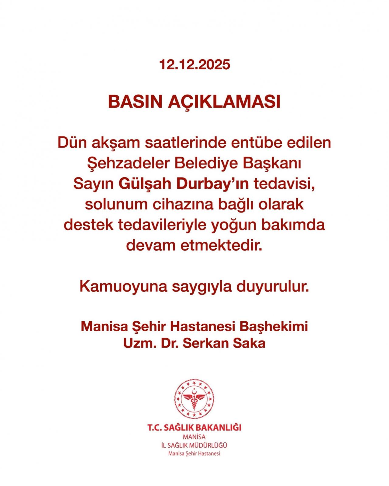 “Dün akşam saatlerinde entübe edilen Şehzadeler Belediye Başkanı Sayın Gülşah Durbay’ın tedavisi, solunum cihazına bağlı olarak destek tedavileriyle yoğun bakımda devam etmektedir. Kamuoyuna saygıyla duyurulur.”