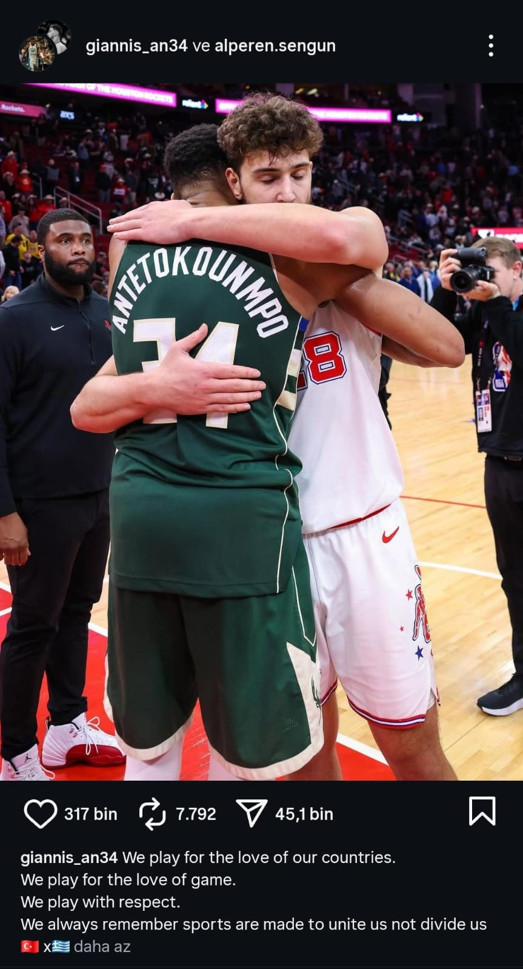 Antetokounmpo ve Alperen, bu paylaşımlarına Türk ve Yunan bayrakları da ekledi.